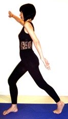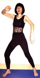 5. (Looking for the sunflower). Slowly turn your body to your left, lower you heels on to the ground, so body is now facing 90°. While your feet hardly moved - as you turn your body, slowly move your right arm upward, palm out, in front of your face, while your left arm moves downward to your rear, palm facing outward.