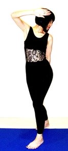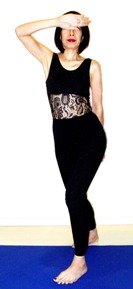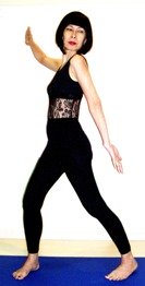 5. (Looking for the sunflower). Slowly turn your body to your left, lower you heels on to the ground, so body is now facing 90°. While your feet hardly moved - as you turn your body, slowly move your right arm upward, palm out, in front of your face, while your left arm moves downward to your rear, palm facing outward.